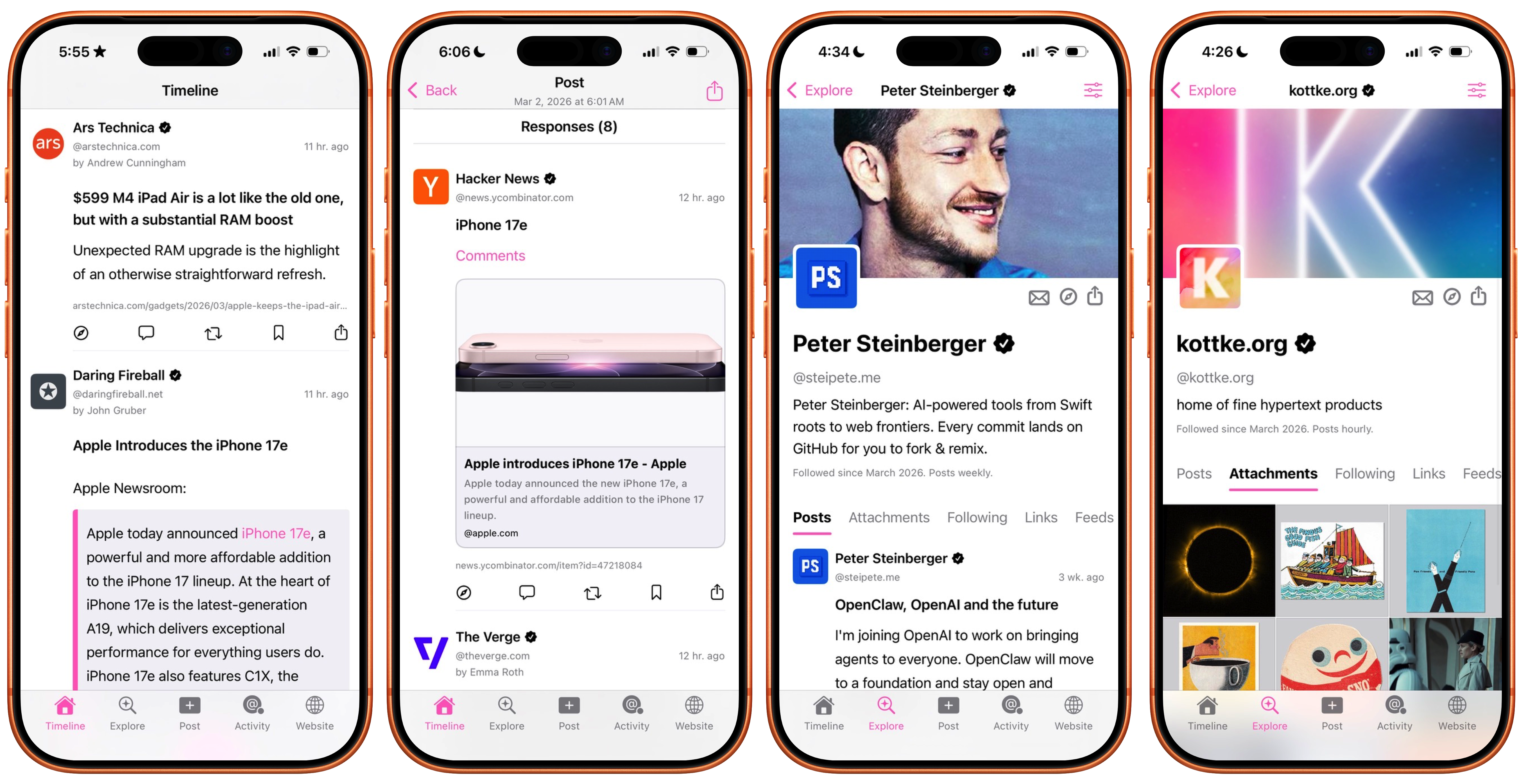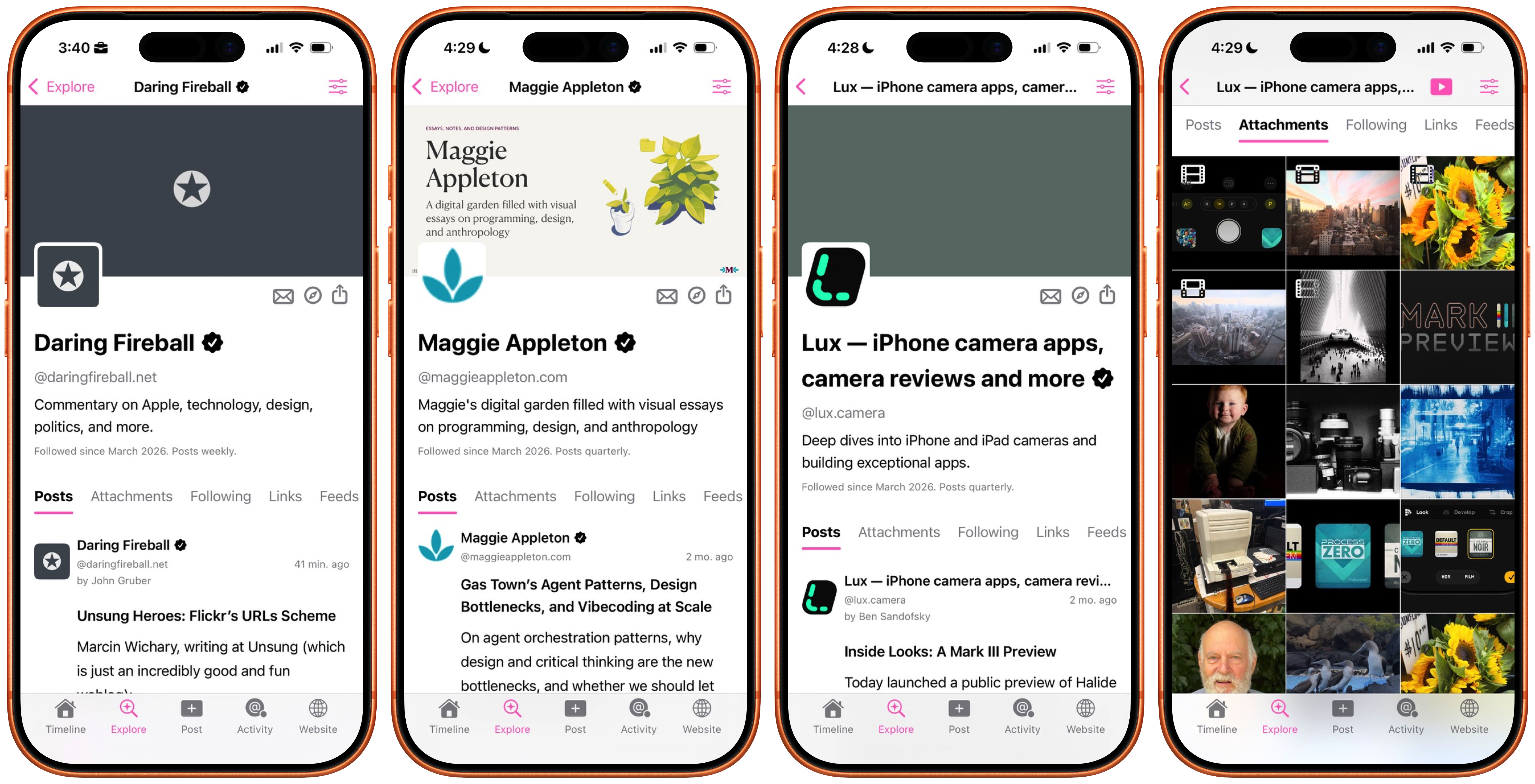 Feeds are automatically grouped together into rich profiles where you can browse an aggregated website timeline, or view text-, audio-, video-, and link- attachments, and more.